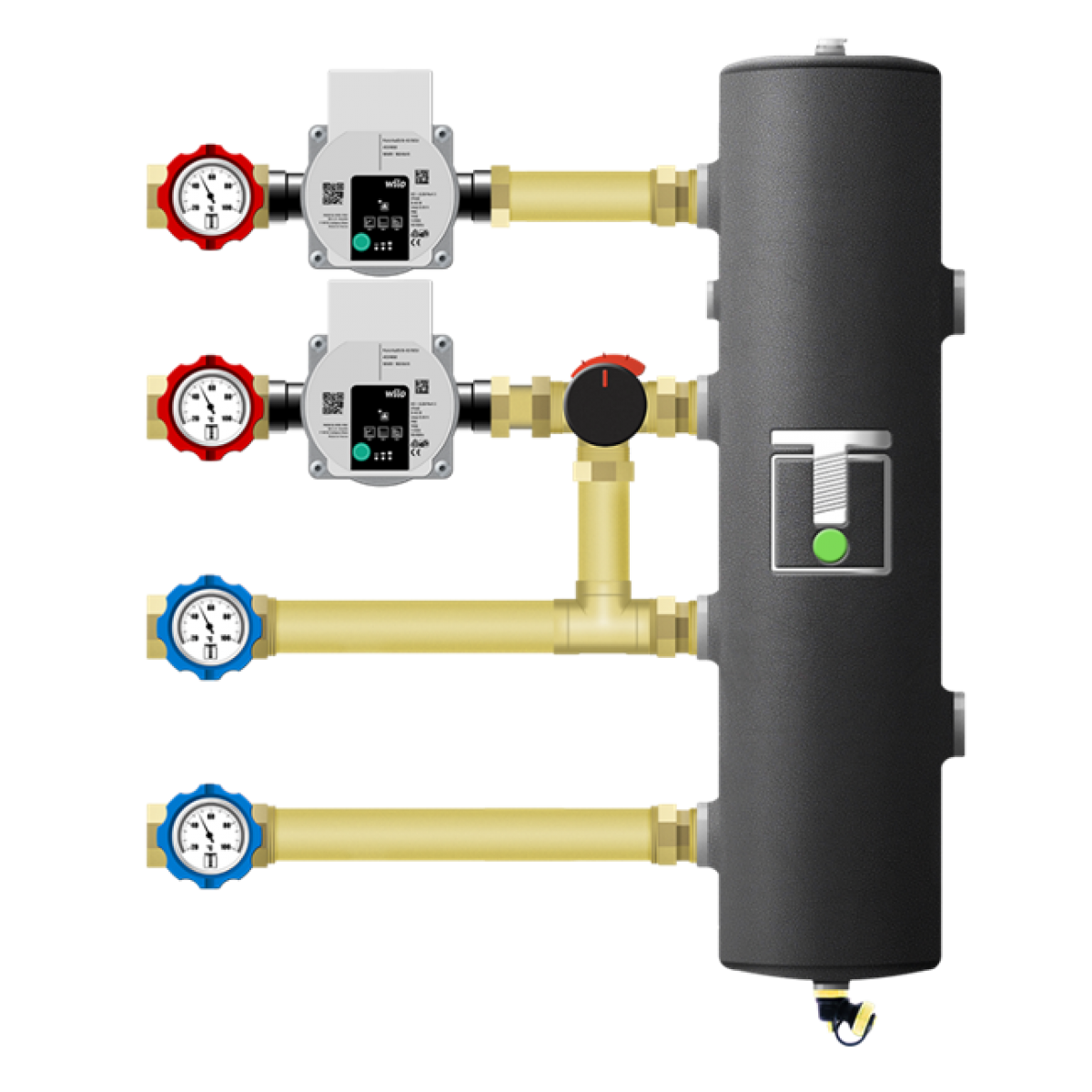 Zestaw ze sprzęgłem w izolacji i grupami pompowymi. Wariant posiada 1 obieg bezpośredni oraz 1 obieg z podmieszaniem - zawór obrotowy 3-drogowy ESBE. Na wyposażeniu po stronie instalacji zawory kulowe 1" z termometrami. Grupa ochrony powrotu jest wyposażeniem dodatkowym - jeśli nie zostanie zamówiona, po stronie źródła ciepła będą tylko króćce przyłączeniowe 1" GW.