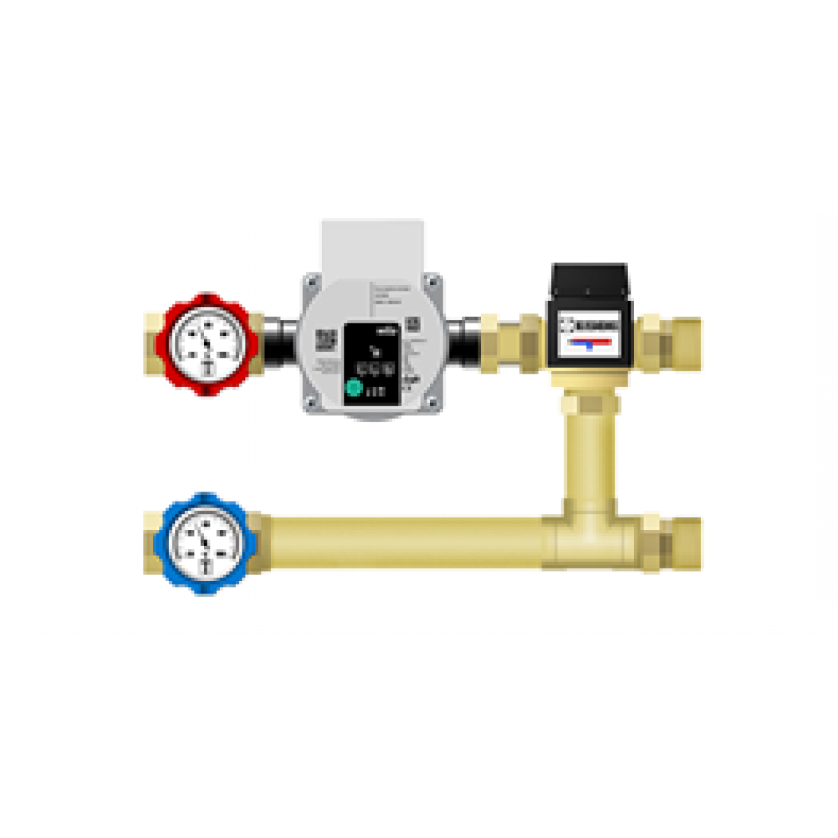 Grupa z zaworem termostatycznym ESBE VTA372 20-55°C (Kvs 3,4) MTW001 (WILO PARA) MTG001 (GRUNDFOS UPM3). Układ posiada 2 zawory kulowe 1" z termometrami. Na powrocie wbudowany zawór zwrotny.