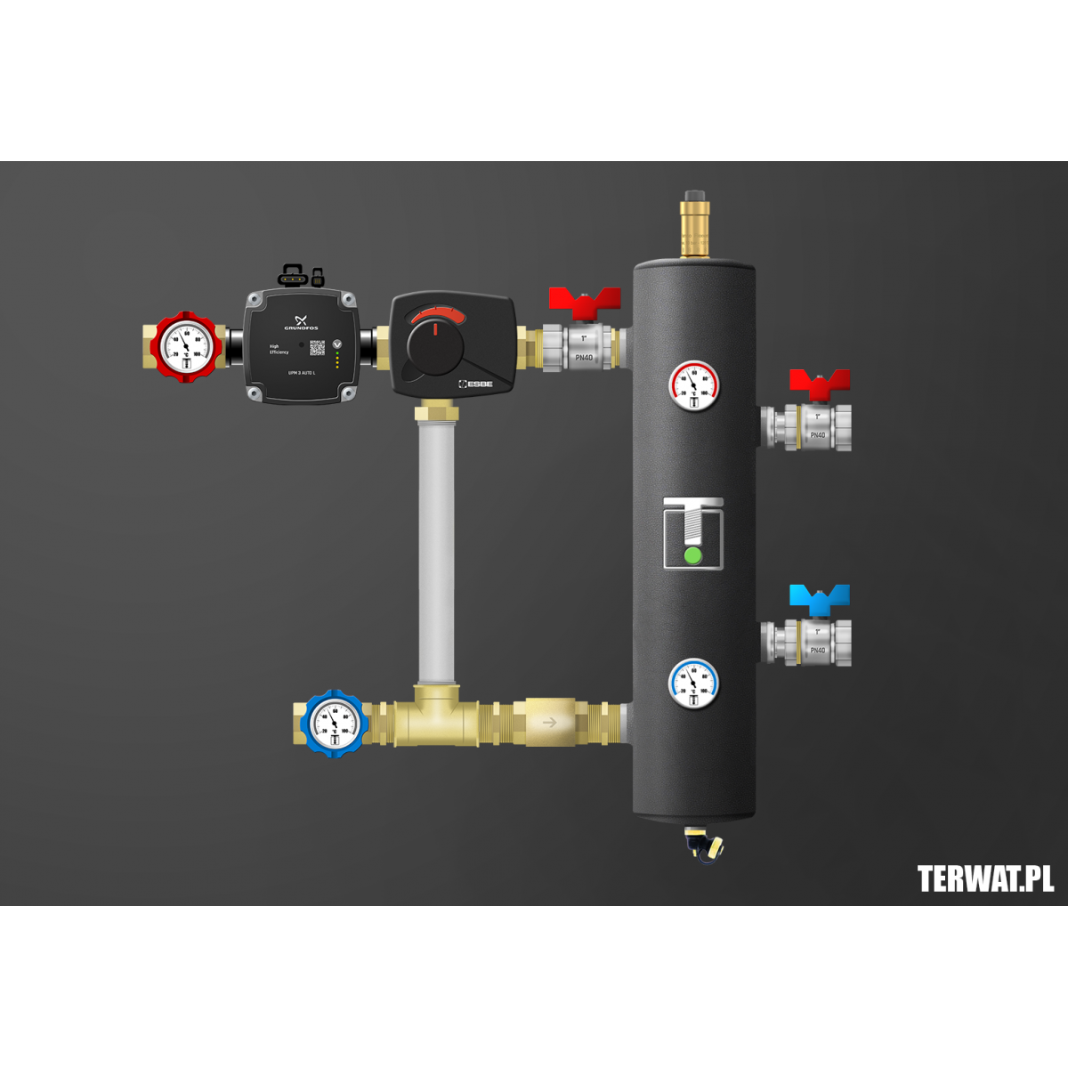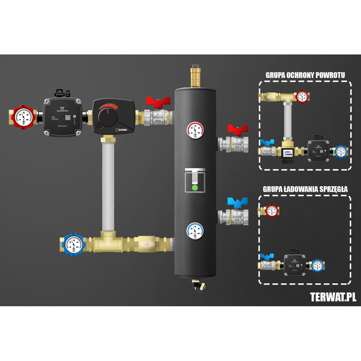 Kompletny zestaw sprzęgła hydraulicznego z jednym obiegiem bezpośrednim. Jedno źródło ciepła. W komplecie zawory odcinające 1” z półśrubunkami po stronie kotła, zawory 1" z termometrami po stronie instalacji, pompy Grundfos UPM 3 AUTO L 15-70 (lub WILO Para), termometry bimetaliczne, odpowietrznik automatyczny Flamco, zawór spustowy, zawory zwrotne na powrotach, izolacja sprzęgła. Kompletny zestaw do montażu w kotłowni. Montaż w pionie i poziomie. Wersja prawa na zamówienie. Opcjonalnie istnieje możliwość zainstalowania przy układzie grupy ochrony powrotu lub grupy ładowania sprzęgła - polecane do kotłów stałopalnych, dla ochrony powrotu i ładowania sprzęgła.