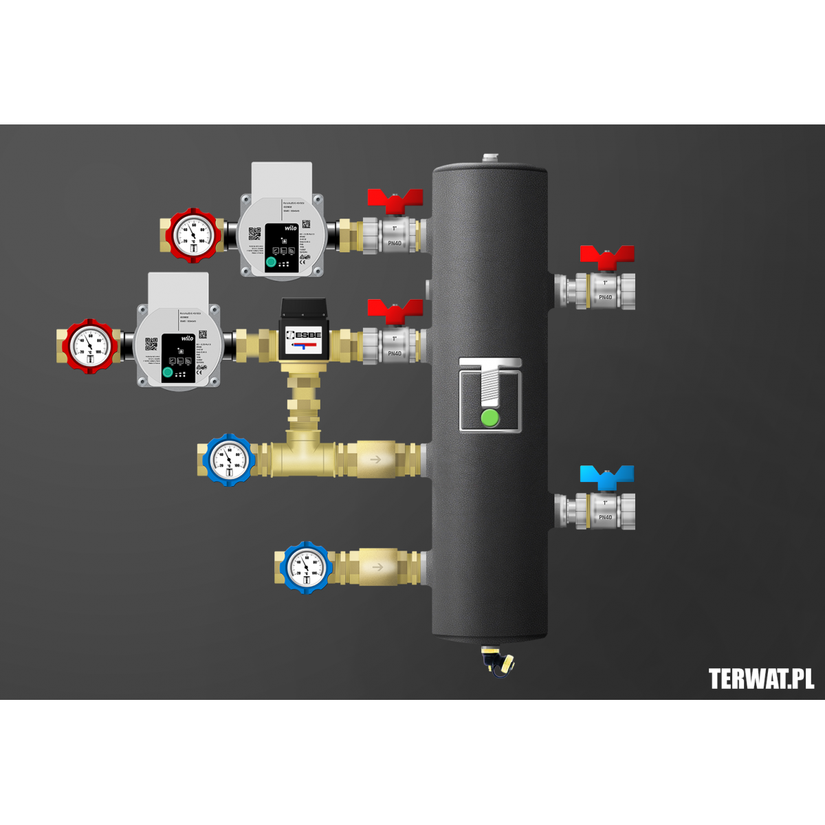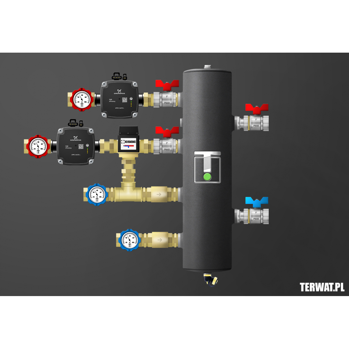 Kompletny zestaw sprzęgła hydraulicznego z dwoma obiegami – jeden bezpośredni, jeden z zaworem mieszającym termostatycznym ESBE 20-55°C Kvs 3.4. Jedno źródło ciepła. W komplecie zawory odcinające 1”, pompy Grundfos UPM 3 AUTO L 15-70 (lub WILO Para), termometry bimetaliczne, odpowietrznik, zawór spustowy, zawory zwrotne na powrocie. Kompletny zestaw do montażu w kotłowni. Montaż w pionie i poziomie. Wersja prawa na zamówienie. Na życzenie zamontujemy kompletną grupę ochrony powrotu kotła stałopalnego z regulowanym zaworem temperaturowym ESBE w zakresie 50-70 st lub grupę ładowania sprzęgła.