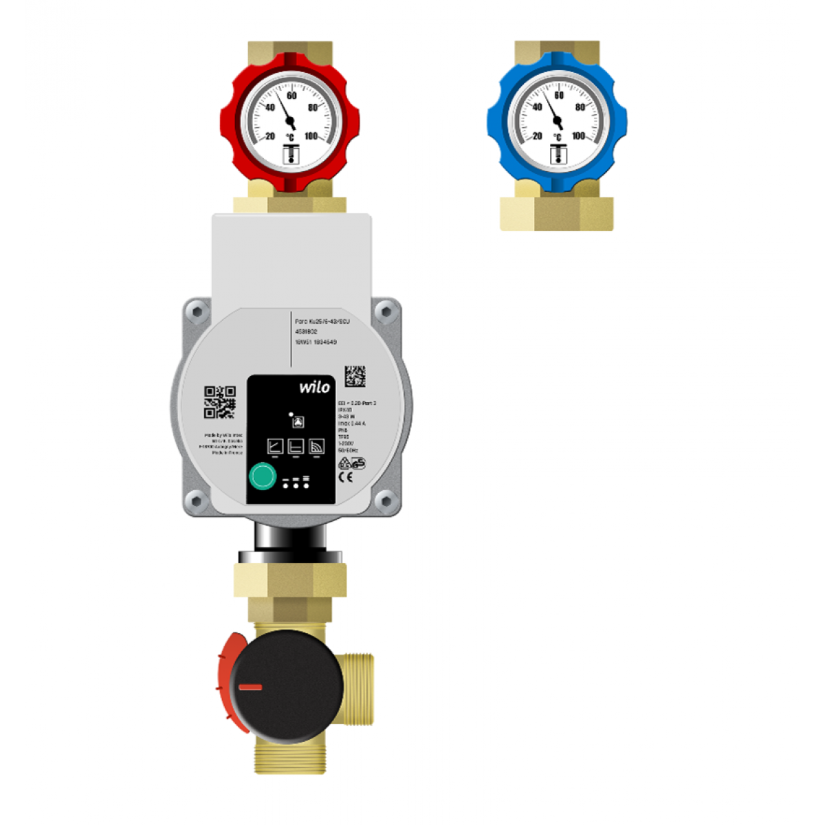 Grupa pompowa odpowiedzialna jest za wytworzenie temperatury o zadanej temperaturze - w tej wersji z zaworem obrotowym z siłownikiem elektrycznym ESBE (Kvs 10) i cyrkulację czynnika do obiegów grzewczych. W tym wypadku wersja bez izolacji, do montażu w kotłowni. Przyłącza 1". Całość napędzana pompą elektroniczną - do wyboru. W zaworze powrotnym zawór zwrotny.