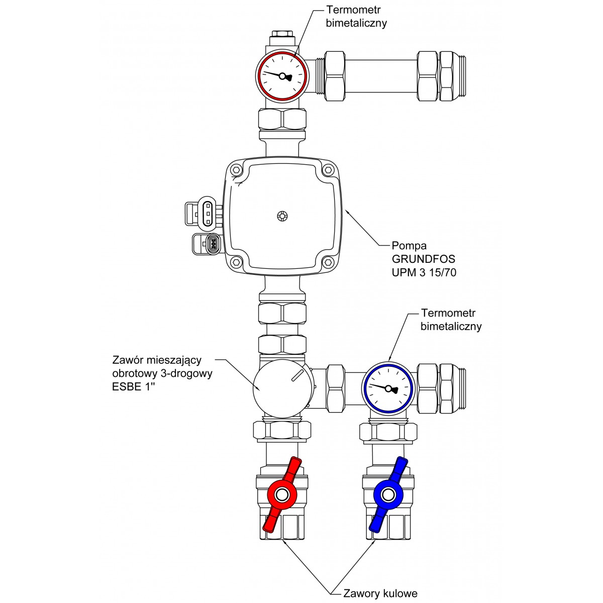 Zestaw mieszający do rozdzielaczy ogrzewania podłogowego z pompą elektroniczną Grundfos UPM3 AUTO L lub Wilo Para 15/6 i zaworem obrotowym 3 drogowym ESBE, wersja bez siłownika.