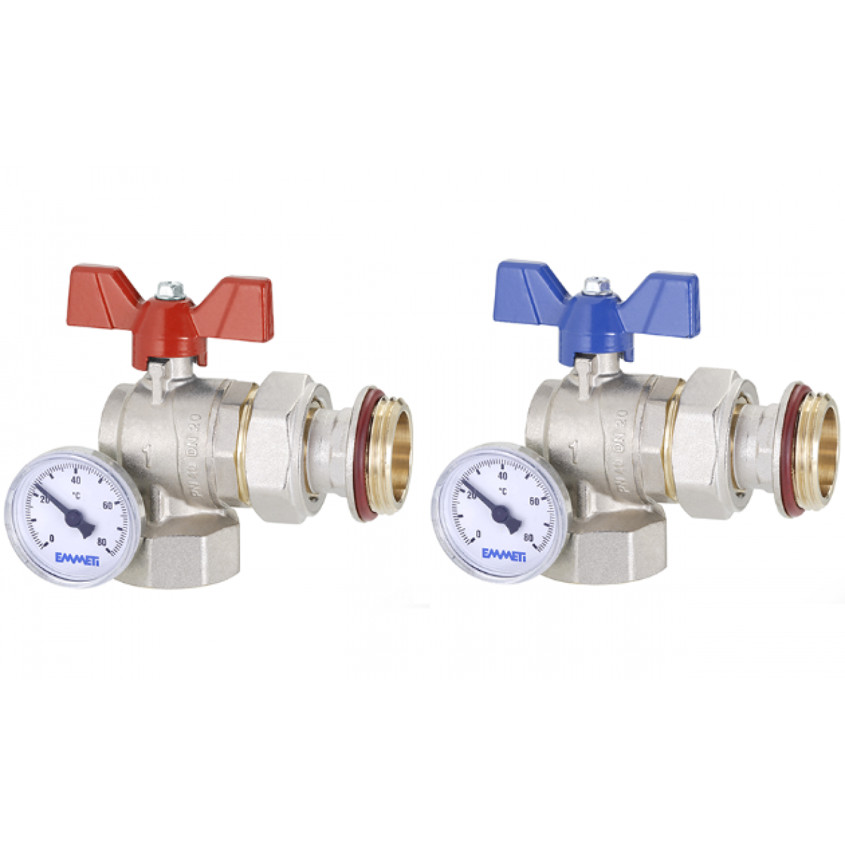 Zawór kulowy kątowy 1” z półśrubunkiem i termometrem do rozdzielacza (2 szt - czerwony + niebieski)